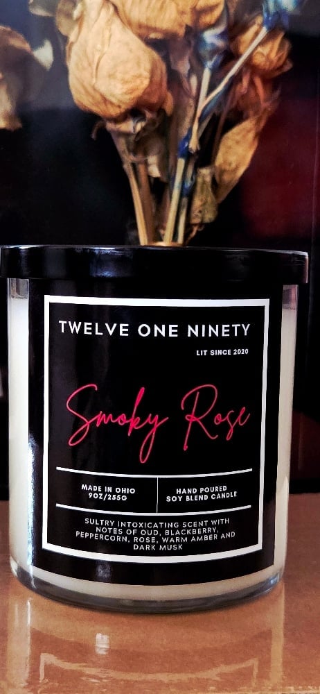 9oz soyblend candle. Sultry, intoxicating scent with notes of oud, blackberry, peppercorn, rose, warm amber and dark musk.